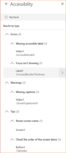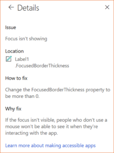 - Fixing Issues: You can click on each issue in the list, and Power Apps will navigate directly to the component in question. From there, you can apply the suggested fixes (such as adding AccessibleLabel properties or adjusting color contrast).